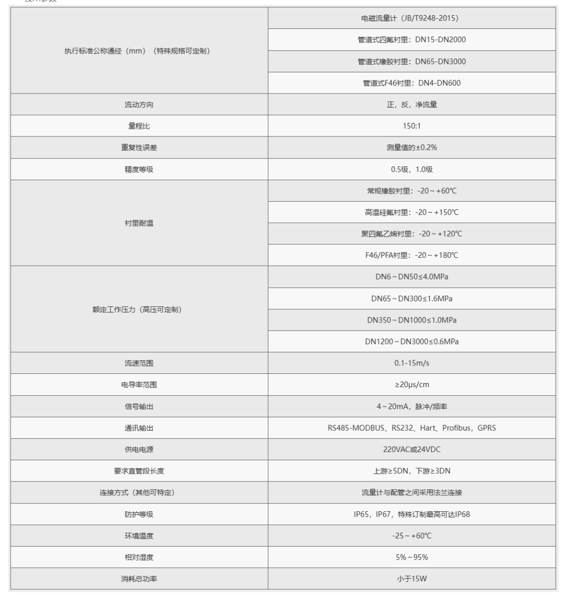 电磁流量计适用于各种酸、碱、盐等强腐蚀性的污水、泥浆、矿浆、纸浆等导电液体的流量、流速、热量等参数测量,精度:0.5级。标配RS485通讯,4-20mA输出。同时可根据客户需求定制无线远传,电池供电,防爆报警型。广泛应用于石油、化工、冶金、轻纺、造纸、环保、食品等工业部门及市政管理,水利建设,河流疏浚等领域的流量计量。