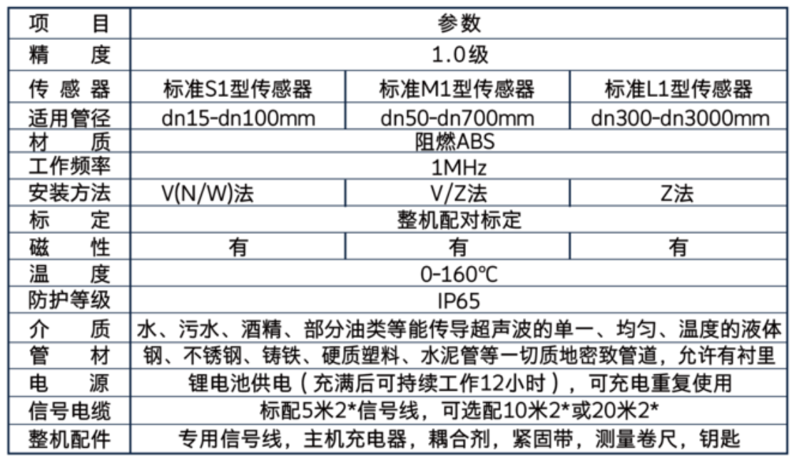 手持式超声波流量计又称便携式超声波流量计,精度:1.0级。流速范围:0.03m/s~64m/s。输出:4-20mA/RS485。管径:DN15~DN3000mm.铝合金箱体整套装配,内含说明书、合格证、手持主机、外夹式传感器、紧固绑带、手持专用信号线、电源线、耦合剂、卷尺、钥匙。主机是18按键,四行高清液晶数显,可显示传输比、流量、流速等数据。具有不破管安装,无压力损失,精度高,稳定性好的特点,可用于巡检测量道走随测,大容量电池,使用寿命长,配套齐全,收纳便捷方便。